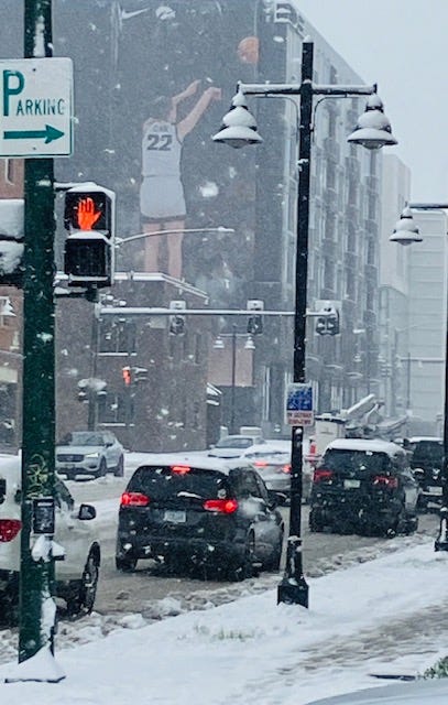 I turn on the car radio and hear my favorite news podcast—the place where I get reliable information about wars and elections and housing affordability. But not today; today, they are talking about Caitlin Clark. The Iowa basketball star is known here, but suddenly she’s known everywhere. She’s BIG. In fact, at the very moment that I heard the podcast, I gazed up through thick March snowflakes at an immense banner of Clark, who seems to be shooting right into our midst.