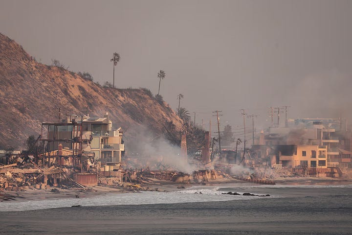 My friend who lives in Malibu described returning to the beach where nearly every house except hers burned down in January. “There was the road (aka Highway 1), and then there was the ocean,” she says. “There was really no ground for a house; I knew this but it didn’t really make sense until I saw the burnt remains.” With her hands, she shows the narrow distance between water and land.